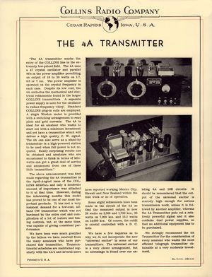 Ad Copy: "The 4A transmitter marks the entry of the COLLINS line in the extremely low-priced field. The 4A uses a 47 crystal oscillator and parallel 46's in the power amplifier permitting an output of 18 to 20 watts on 1.7, 3.5 or 7 mc. The power amplifier is operated on the crystal frequency in each case. Despite its low cost, the 4A embodies the mechanical and electrical refinements found in the larger COLLINS transmitters. A separate power supply is used for the oscillator to reduce frequency "chirp." Standard COLLINS plug-in coils are employed. A single Weston meter is provided with a switching arrangement to read plate and grid currents. The 4A is ideal for an amateur who wants to start out with a minimum investment and yet have a transmitter which will deliver a high quality C. W. signal. The 4A can also serve as a stand-by transmitter in a high-powered station to be used when full power is not required.