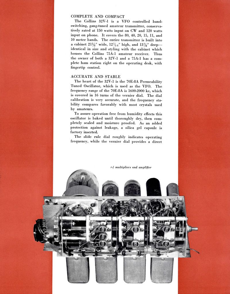 The 32V-1 is an HF (80, 40, 20, 15, 11 &10 meter band) Amateur Radio Transmitter rated at 150 Watts CW and 120 Watts AM (phone). It utilizes the 70E-8A Permeability Tuned Oscillator as the RF source.