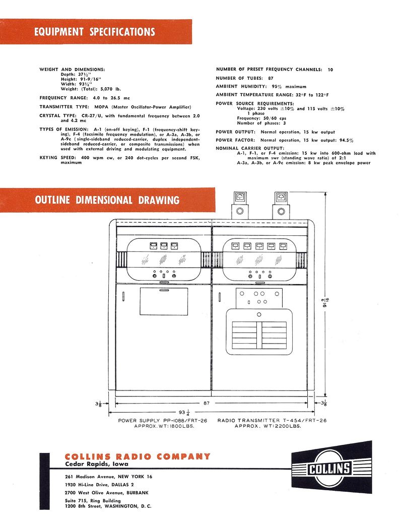 The FRT-26 is a 15KW HF (4-26.5 mc) Transmitter intended for A-1, F-1, F-4, A-3a, A-3b, or A-9c emission.